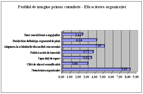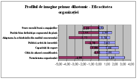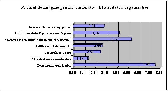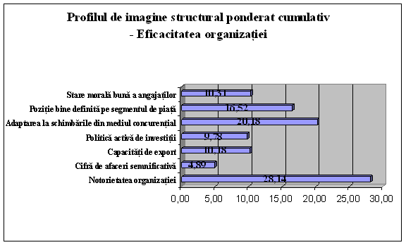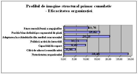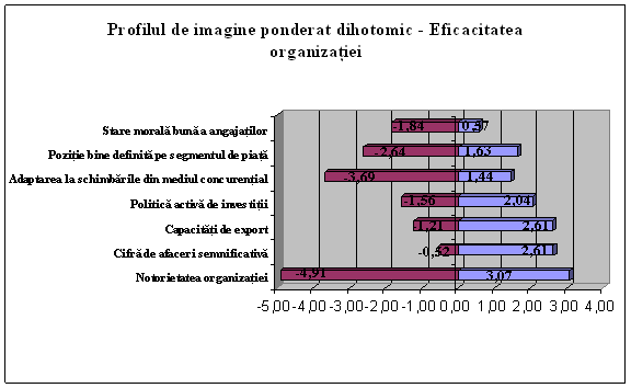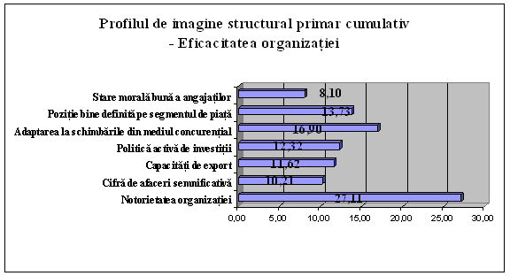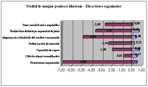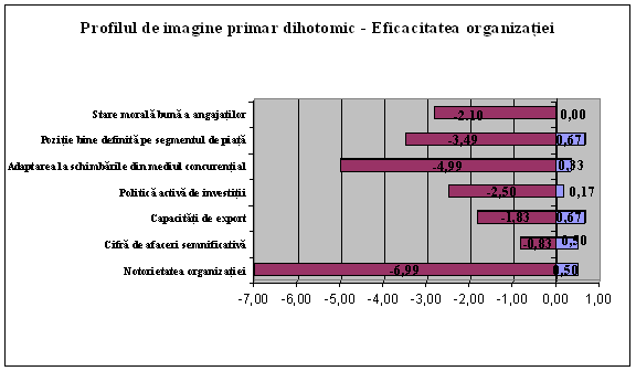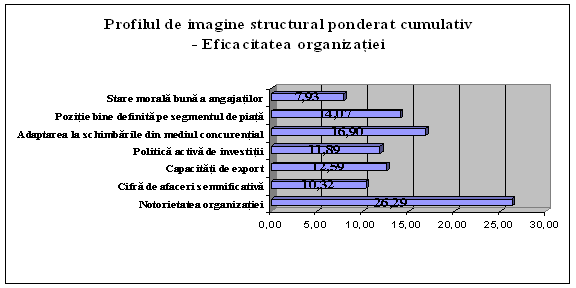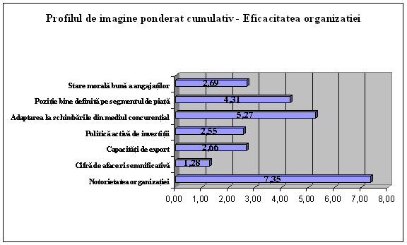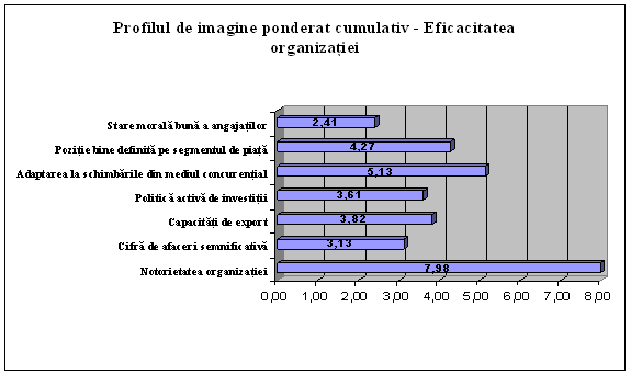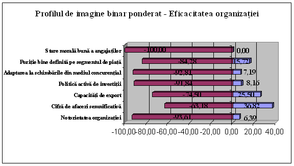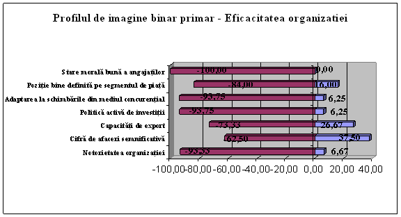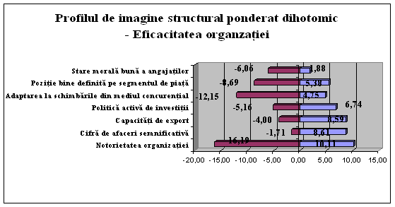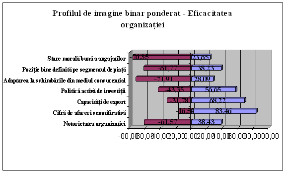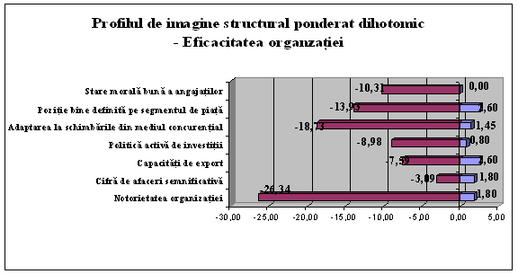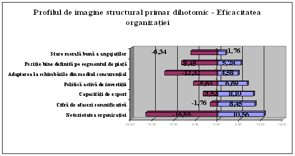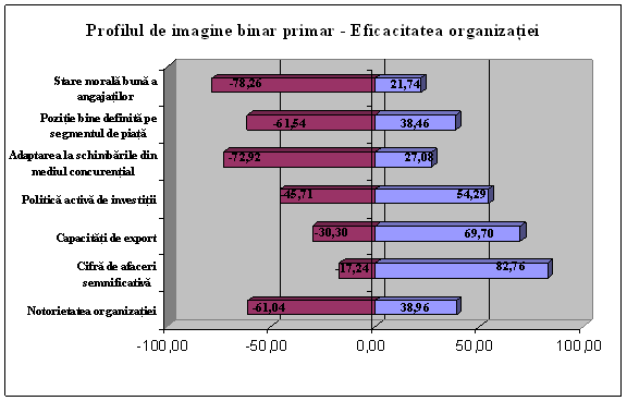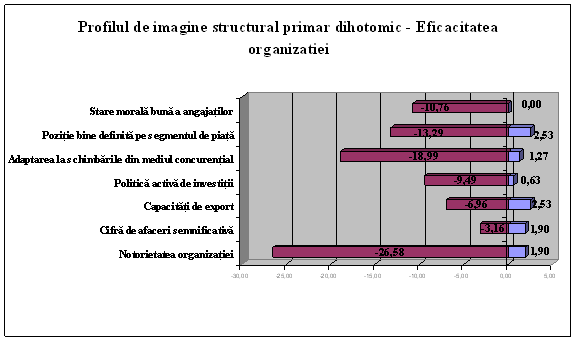 In cadrul primului indicator, Eficacitatea organizatiei, valorile pozitive sunt apropiate de cele negative. Acest lucru se realizeaza in special subindicatorilor Politica activa de investiti si Pozitie bine definita pe segmentul de piata, ale caror valori pozitive sunt apropiate de cele negative. Totodata, subindicatorii Capacitati de export si Cifra de afaceri semnificativa inregistreaza ponderi pozitive.