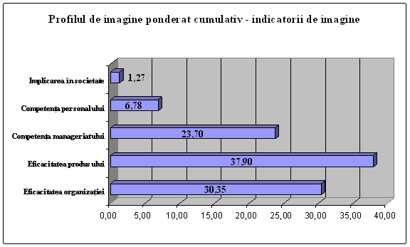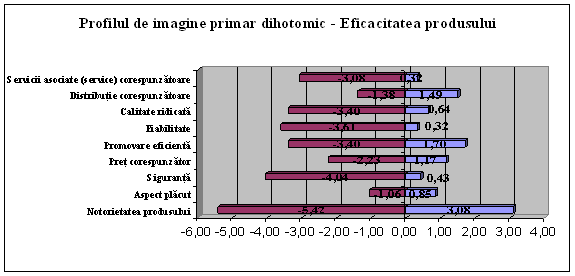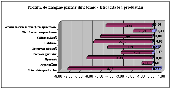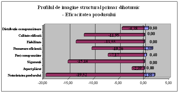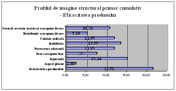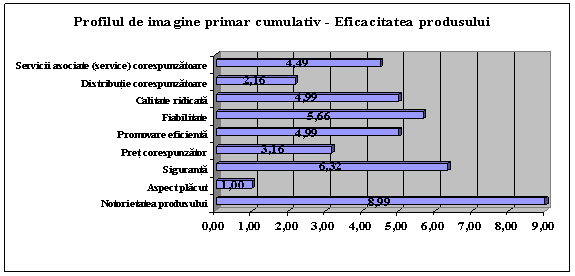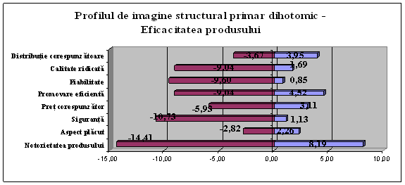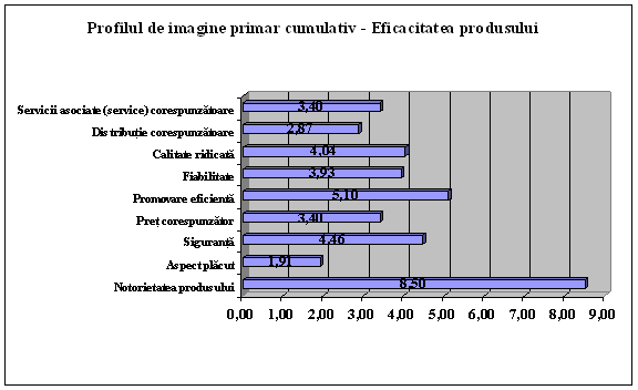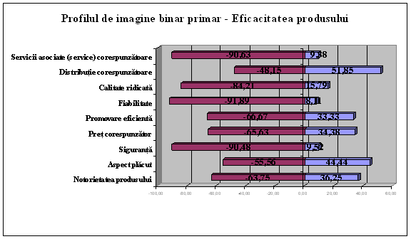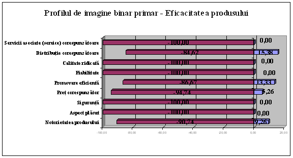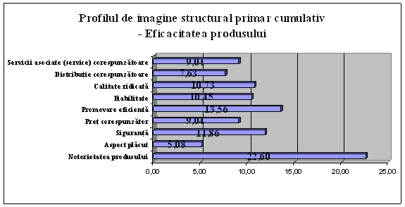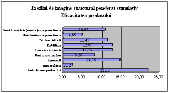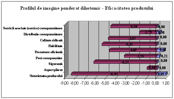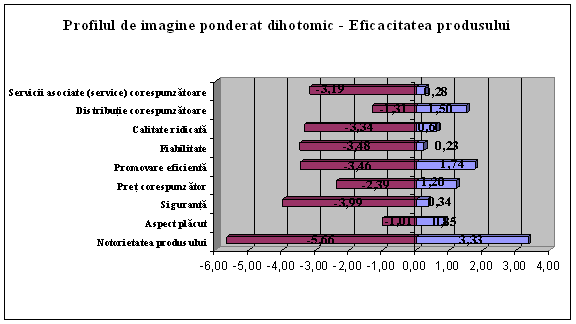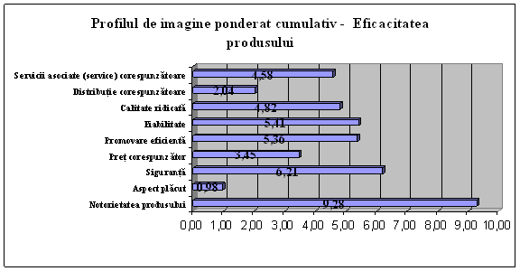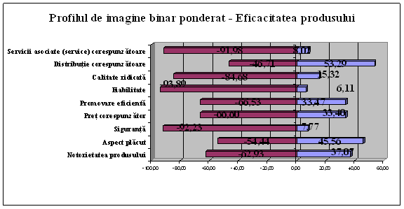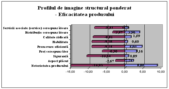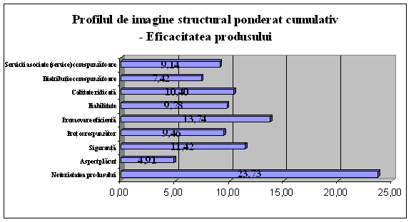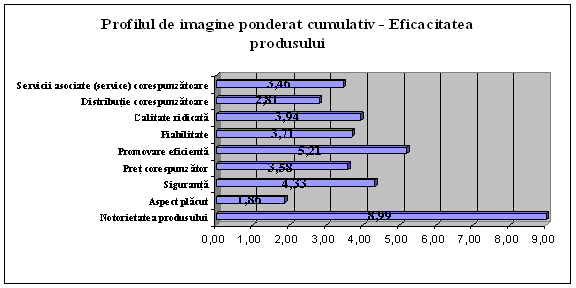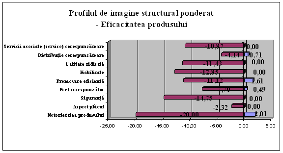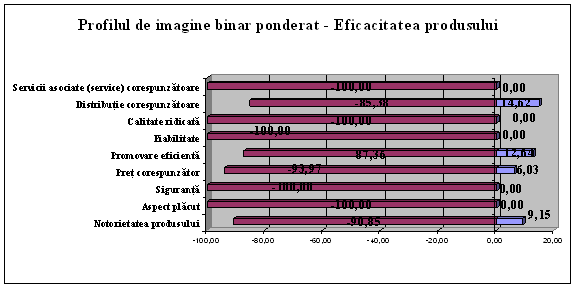 In cazul celui de-al doilea indicator, Eficacitatea produsului, ponderi negative mari apar in cadrul subindicatorilor Notorietatea produsului, Siguranta, Promovare eficienta si Fiaiblitate. Acesti subindicatori inregistreaza ponderi negative cu valori cuprinse intre 5,66% si 3,34%. Totodata, analizand profilul ponderat cumulativ observam ca interesul se concentreaza tot asupra acestor subindicatori. Astfel, indicatorul Notorietatea produsului detine 8,99% din totalul de 37,9% al acestui indicator. Caracterul imaginii subindicatorului este preponderent negativ, iar caracterul imaginii indicatorului este puternic negativ.