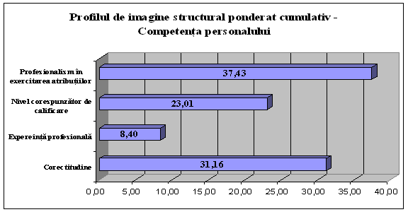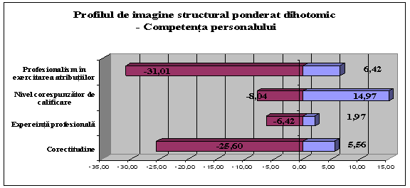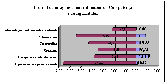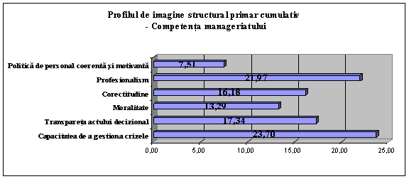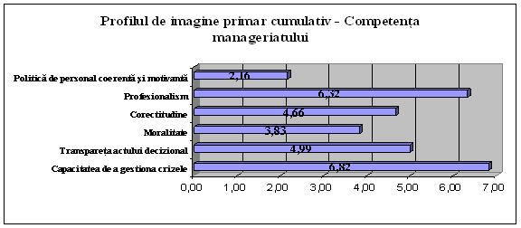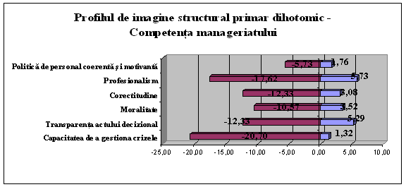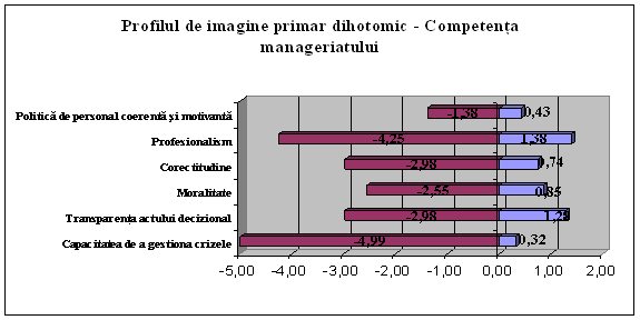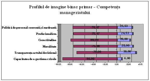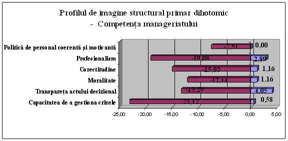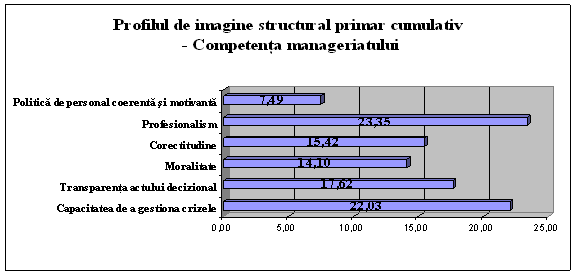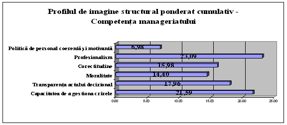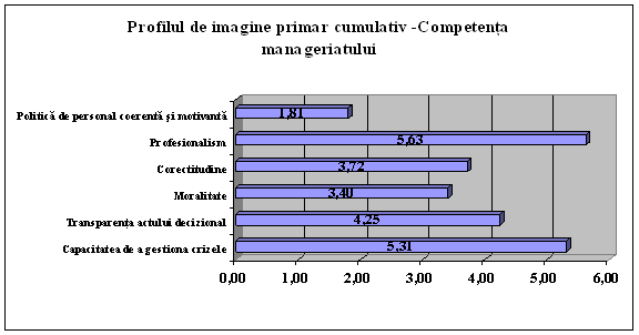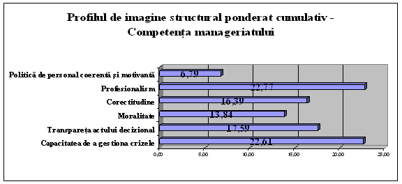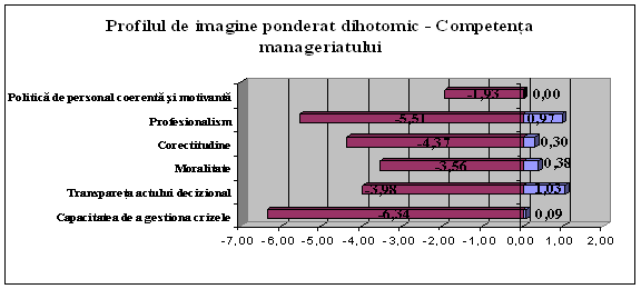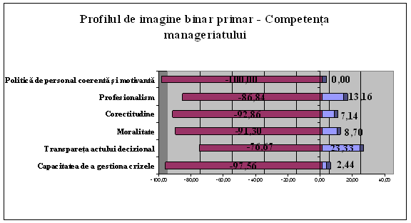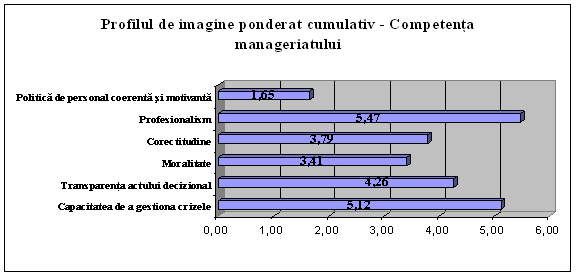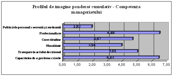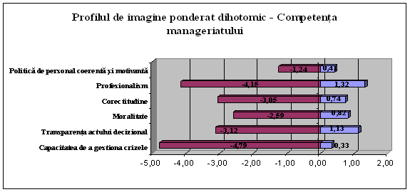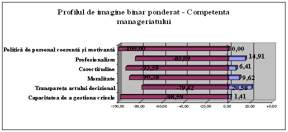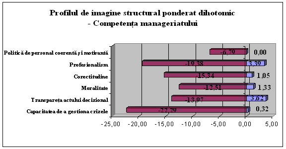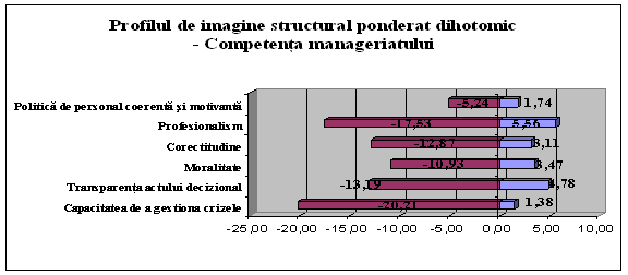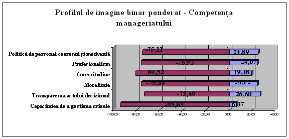 In cazul celui de-al treilea indicator, Competenta manageriatului, ponderi negative apar la subindicatorii Capacitatea de a gestiona crizele si Profesionalism. Acestia sunt si subindicatorii asupra carora se concentreaza atentia mass-media. Caracterul imaginii acestor subindicatori este puternic, respectiv preponderent negativ. Subindicatorii Corectitudine si Transparenta actului decizional se potenteaza reciproc negativ. Aceste ponderi negative se datoreaza in special lipsei de comunicare a organizatiei cu publicurile tinta interne si externe.