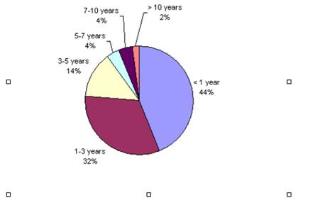 Pentru o evaluare corecta a personalului, echipa de Resuse Umane a realizat o analiza privind vechimea angajatilor din companie(Figura 1.).In urma acesteia s-a observat ca procentul cel mai mare de angajati care incep sa paraseasca compania sunt cei cu o medie de 3-5 ani. Urmeaza apoi un procent semnificativ al angajatilor intre 5-7 ani neinteresati de acest nou proiect.