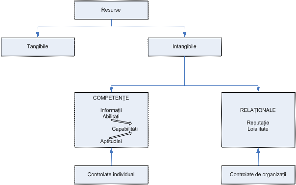 In concluzie resursele intangibile se impart in doua categorii : a. competente individuale si organizationale si b. competente relationale care sunt legate construite si masurabile in raport de mediul extern general si competitional cum ar fi : reputatia firmei si loialitatea clientilor, partenerilor, actionarilor. In figura 1 prezentam o schema a resurselor conforma cu analiza de mai sus.
