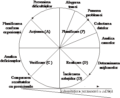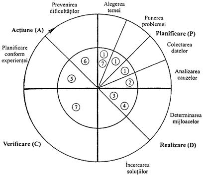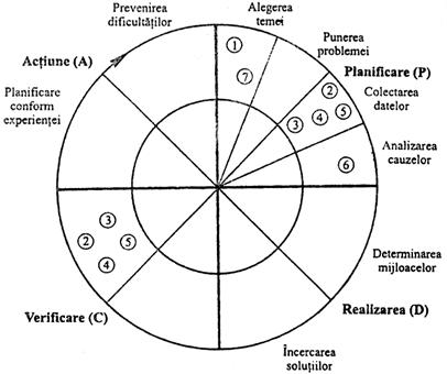 "Roata lui Deming" este acum considerata in Occident ca si in Japonia ca fiind metoda universala, ciclul de baza al oricarei actiuni de imbunatatire a calitatii, fie ea si rezolvarea unei probleme (fig. 1.) [18]. Este vorba de un principiu sub forma de bucla, recursiv, deci mai satisfacator decat o metoda lineara prea detaliata, mai putin naturala si eventual prea rationala.