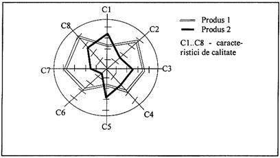 Pe fiecare raza se marcheaza marimea elementelor, astfel incat valoarea cea mai mica sa corespunda cu centrul cercului (fig. ). Graficul radar poate fi utilizat pentru analiza comparativa a calitatii produselor, activitatilor, proceselor, luand in considerare mai multe caracteristici (criterii).