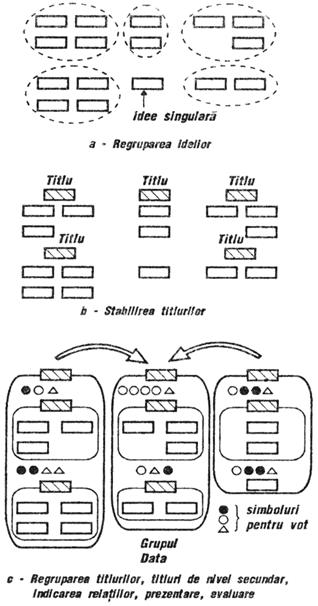 - regruparea ideilor (fig. 1 a) - pe baza punerii de acord asupra celor scrise, membrii grupului grupeaza ideile lansate in grupe cu aceeasi semnificatie; propunerile (ideile) care nu pot fi incadrate intr-o anumita problematica sunt mentinute ca idei singulare;