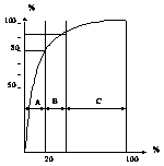 d) Diagrama Pareto permite evidentierea celor mai importante elemente ale unei probleme, asupra carora trebuie actionat cu prioritate. Acest tip de diagrama a fost utilizat, pentru prima data de M. D. Lorenz, pentru a ilustra distributia neuniforma a avutiei nationale. El a observat ca 80% din aceasta apartine unui numar restrans de persoane, reprezentand circa 20% din totalul populatiei. In mod eronat, diagrama utilizata de el a fost identificata cu diagrama lui Vilfredo Pareto, totusi denumirea eronata a ramas (fig. 10.7).