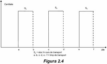 'Stocul in curs de transport' reprezinta cantitatea de resurse materiale care se gaseste in mijloacele de transport pe timpul deplasarii acestora de la sursele de furnizare la depozitele destinatarilor. Acest stoc, care se mai numeste 'de tranzit', poate fi mai mare sau mai mic, in functie de distanta de transport si de mijlocul de transport folosit in deplasarea materialelor. Asemenea stocuri se creeaza si in interiorul unitatilor economice, cu deosebire in cazul celor care au subunitati componente dispersate territorial (filiale, sectii, uzine de asamblare, santiere etc.), asa cum se va mentiona ulterior (vezi stocul pentru transport intern). Stocul in curs de transport este sursa materiala de reintregire a celui curent; marimea lui este, de regula, la nivelul cantitatii de materiale comandate (figurile 2.3 si 2.4).