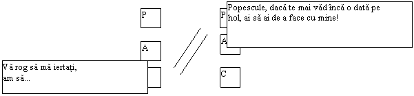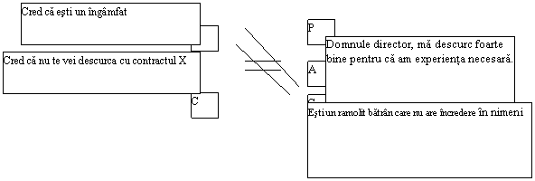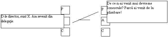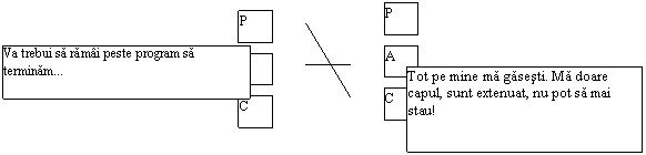 In exemplul de mai sus, starea de parinte normativ a sefului se adreseaza starii de copil a subalternului, care raspunde cu starea de copil adaptat, adresandu-se parintelui afectiv a sefului si cerandu-i ajutorul'