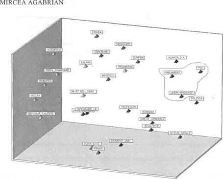 Scalarea multidimensionala genereaza o harta perceptuala care are o acuratete mai mare decat dendrograma produsa de analiza ierarhica cluster. Logica ei consta intr-o configuratie geometrica de puncte in care cu cat itemi sunt mai similari (co-ocurenta lor este mai frecventa), cu atat distanta dintre ei pe harta va fi mai mica si, cu cat sunt mai diferiti in termeni de similaritate, cu atat pozitiile lor pe harta vor fi mai departate. De pilda, spre deosebire de pozitia din dendrograma, categoria LIDERISINDICATE este plasata pe harta perceptuala din figura 8.6 in grupul format cu PSD si PARLAMENT si foarte aproape de categoria POLITICA. Constatarea ne permite sa avansam ipoteza prezentei politicului in viata sindicala si in desfasurarea grevei profesorilor.