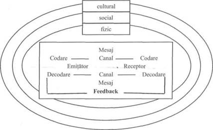 Figura 3.4 prezinta modelul contextual. Aici, un alt termen este nou si important: feedback-ul. Norbert Wiener a creat notiunea de feedback, ce ia in considerare posibilitatea de "raspuns' din partea destinatarului mesajului care influenteaza comportamentul viitor al celor angajati in comunicare. Feedback-ul ne reaminteste ca orice comunicare este adesea realizata pe doua cai sau, cu alte cuvinte, exista raspunsuri la mesajele trimise. Datorita acestui lucru, ne corectam modul in care purtam conversatia potrivit feedback-ului pe care il obtinem de la cealalta persoana. Canalul care poarta feedback-ul nu trebuie neaparat sa fie vorbirea, el poate fi nonverbal, de pilda, o expresie plictisita. Observam ca in figura am schimbat cuvintele "sursa' si "destinatie' cu "emitator' si "receptor'. Putem decide singuri care notiuni sunt mai utile.