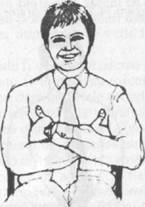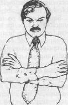Cele doua brate se impletesc pe piept de parca ar incerca sa se 'ascunda' de o situatie nefavorabila. Exista mai multe pozitii de incrucisare a bratelor, dar in aceasta carte ne vom ocupa doar de trei dintre ele, care sunt cele mai raspandite. Gestul obisnuit al incrucisarii bratelor (Figura 70) este un gest universal care exprima, aproape pretutindeni, o atitudine defensiva sau negativa. Este imaginea obisnuita a omului care, ajungand in mijlocul unor necunoscuti - la mitinguri, la cozi, in cofetarii, in lift sau in alte locuri - se simte stingherit sau nesigur.
