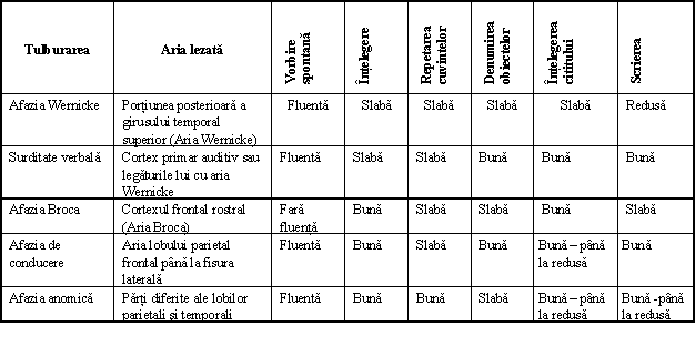 Prezentam, dupa datele lui Neil R.Carlson (1991), un tabel al tulburarilor de tip afazic raportate la vorbire-intelegere-scriere.
