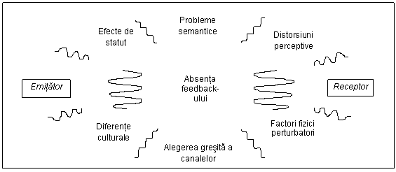 Comunicarea poate fi obstructionata sau doar perturbata de o serie de factori care se interpun intre semnificatia intentionata (E) si cea perceputa (R) putand fi legati de oricare din componentele comunicarii (emitator, mesaj, canal, receptor) sau de interactiunea lor.