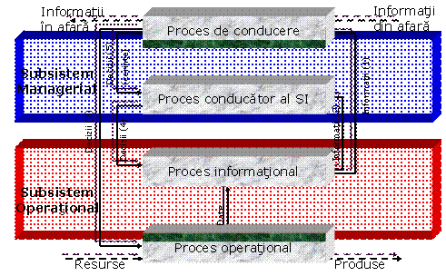 Al doilea element al sistemului informational il constituie procesul managerial al sistemului, care are la baza metode specifice de conducere, similare managementului sistemului economic in ansamblu. Subsistemul managerial are un rol special, receptionand informatii si decizii (cerinte) pe de o parte, iar pe de alta parte, transmitand la randul sau decizii. Deciziile pe care le receptioneaza sub forma cerintelor de informatii au scopul de a mentine si asigura o concordanta deplina intre sistemul economic si sistemul informational care il caracterizeaza (figura 1). Cerintele sunt de genul crearii unor noi informatii, abandonarii unor informatii care nu mai sunt necesare conducerii sistemului economic, imbunatatirii unor metodologii de calcul al indicatorilor etc.