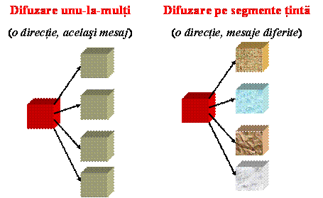 Comunicarea pe segmente tinta presupune, de asemenea, un singur emitator si mai multi receptori, dar fiecare receptor primeste un mesaj diferit. Comunicarea interactiva unu-la-unu implica un emitator-receptor si un receptor-emitator, care schimba intre ei mesaje individualizate, personalizate. In comunicarea interactiva multi-la-multi fiecare protagonist poate juca atat rol de emitator, cat si de receptor.