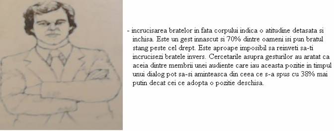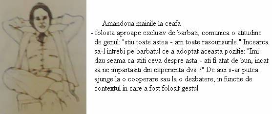 - Incrucisarea picioarelor, mainilor, evitarea contactului vizual, lasarea pe spatarul