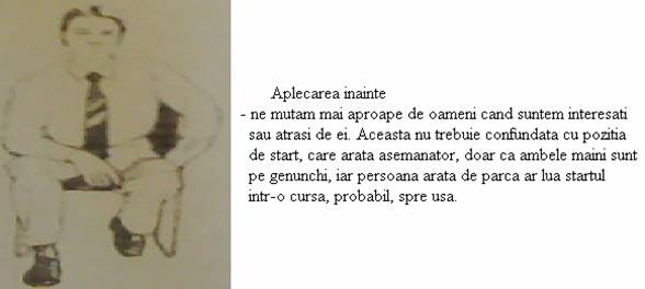 - tinuta si miscarile care afecteaza pozitia corpului: aplecarea inainte sau inapoi (arata disponibilitate sau respingere), trecerea greutatii corpului de pe un picior pe altul, balansul trupului, linia coloanei (capul plecat si umerii cazuti semnaleaza obedienta, inferiorizare, slabiciune sau timiditate), a gatului si capului, pozitia in picioare, asezat, culcat, picior peste picior.