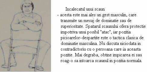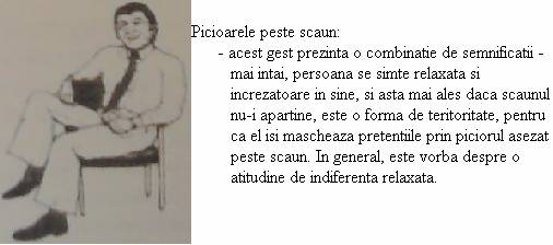 - pozitia picioarelor: larg deschise - multumire de sine, relaxare, siguranta; stranse: speriat, incomod, formalist;