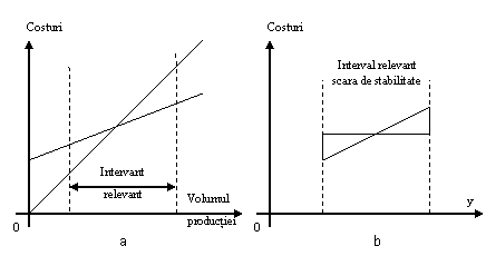 Diagrama cost - venit - profit (fig.2.24,a) are la baza anumite ipoteze care limiteaza generalizarea consideratiilor asupra realitatiii economice examinate. Pe de o parte, ipoteza restrictiva a stabilitatii comportamentului venitului si costului pentru orice nivel al activitatii desfasurate. Pe de alta, dependenta exclusiva a costului de volumul realizarilor de bunuri si servicii comercializate. Fara indoiala, evolutia costurilor este influentata de interactiunea inregistrata intre anumiti factori, precum: volumul fizic al productiei; pretul unitar al resurselor materiale, umane si informationale; productivitatea; nivelul tehnologiilor. In ambele ipoteze insa, se pune problema determinarii cat mai riguroase a intervalului relevant sau de stabilitate (fig.2.24,b) si, implicit, restrangerea acestuia.