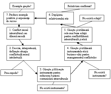 Relativismul etic percepe moralitatea universala ca fiind strans legata de cultura si de civilizatie. Daca apare un conflict moral sau o dilema in cazul unei comunicari interculturale, atunci ii revine managementului responsabilitatea de a solutiona adecvat conflictele morale si valorice (fig.2.38).
