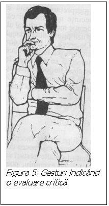 Figura 5 arata grupul de gesturi comune indicand o evaluare critica. Cel mai important este gestul mainii sprijinite pe obraz, cu degetul aratator ridicat, in timp ce un alt deget acopera buzele, iar degetul mare sprijina barbia. Dovezi in plus ca acest ascultator il priveste in mod critic pe vorbitor sunt picioarele asezate strans unul peste altul si celalalt brat pus de-a curmezisul pe piept (pozitie defensiva), precum si capul si barbia lasate usor in jos (ostilitate). Aceasta 'propozitie' non-verbala afirma ceva de genul urmator: 'Nu-mi place ce spuneti si nu sunt de acord cu dv. '.daca ar spune ca a fost incantat de ceea ce dvs. ati afirmat, el ar minti, deoarece cuvintele si gesturile sale ar fi in discordanta. Cercetarea arata ca semnalele non-verbale au o importanta de cinci ori mai mare decat cele verbale, iar cand cele doua sunt in discordanta oamenii se bizuie pe mesajul non-verbal, continutul verbal putand sa nu fie luat in consideratie.