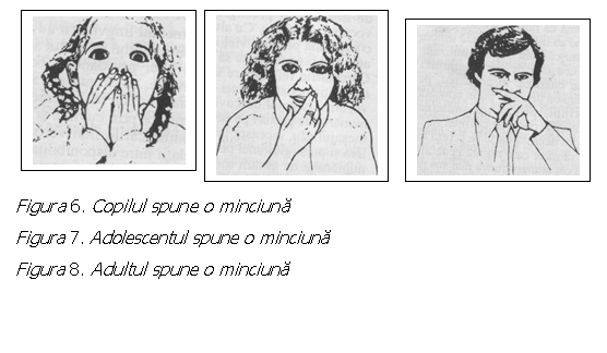 Rapiditatea unor gesturi si evidenta lor in ochii altora este in legatura si cu varsta individului. De exemplu, daca un copil de cinci ani spune o minciuna parintilor, el isi acopera de indata gura cu o mana sau cu amandoua (Figura 6). Gestul acoperirii gurii alerteaza parintii in privinta comiterii minciunii. Acest gest va fi utilizat si in continuare, in decursul intregii vieti, modificandu-se doar viteza aplicarii lui. Cand minte, un adolescent isi ridica si el mana la gura ca si copilul de cinci ani, dar, in loc de acoperirea brusca a gurii, degetele vor mangaia usor buzele (Figura 7).