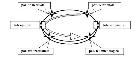 intre modele. Orice diferend pe tema adevarului unui model teoretic al comunicarii trebuie sa aiba in vedere relativismul fiecarei abordari, prin declararea pozitiei cercetatorului intr-unul dintre cele patru cadre paradigmatice majore. Diferitele paradigme ale comunicarii se poate distribui, folosind, de pilda, modelul clasic elaborat de C. F. Shannon in Teoria matematica a comunicarii (1952), prin centrarea pe un anumit element al sau. Acesta poate sa fie emitatorul/receptorul, fenomenele de (de)codare, canalul de comunicare, sau retroaferentatia. In esenta, paradigmele comunicarii gliseaza fie spre polul intrapsihic fie spre cel intersubiectiv, fara a fi exclusiv axate pe unul dintre ele. Intrucat disjunctia intrapsihic-intersubiectiv se instituie pe fondul unei antinomii a carei geneza impune simultan doua coordonate polare (ego si alter, inauntrul subiectului si inafara sa, in relatie cu Celalalt) intre care exista o cauzalitate circulara (individul se constituie prin relatie cu lumea care restituie individul), raportul dintre paradigme este de asemenea circular, de proximitate, in care diferenta se face prin nuanta si grad si nu prin natura. Intr-o astfel de reprezentare (vezi fig.), paradigma structurala se afla in proximitatea celei tranzactionale, ordonate spre polul intrapsihic, in timp ce paradigmele relationala si fenomenologica alcatuiesc o grupa omoloaga, aflata in vecinatatea polului intersubiectiv-relational. Circularitatea are avantajul reprezentarii dinamice a paradigmelor care pot fi utilizate ca decodor privilegiat, in functie de structura si relatiile semnificative care au marcat personalitatea cercetatorului, fiind percepute nu atat ca imagini statice cat ca reprezentari cu potential dinamic, intersanjabil.
