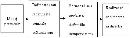 Aceasta strategie consta, deci, in descrierea expectatiilor sociale ale grupului in cadrul caruia are loc actiunea, oferind definitii culturale referitoare la conduita cea mai adecvata. Cheia consta in faptul ca mesajul trebuie sa produca aparenta unui consens, adica, trebuie aratat ca definitiile oferite sunt sustinute de grupul relevant, iar refuzul de a se conforma ar insemna un comportament deviant inacceptabil. Reprezentata schematic, aceasta strategie pentru dezvoltarea unei teorii a persuadarii ar arata ca in figura urmatoare:
