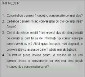Duceti-va la o petrecere, la o scoala, facultate, discoteca etc., sau oriunde oamenii se intalnesc pentru prima oara. Ascultati cum isi incep conversatia. Faceti o lista cu 'moduri de incepere a unei conversatii'. Confruntati aceasta lista cu cele ale colegilor, separandu-le pe acelea care sunt eficiente si de ce si care credeti ca sunt ineficiente si de ce.