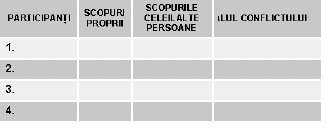 1. Faceti o lista a conflictelor in care ati fost implicat(a) saptamana trecuta.