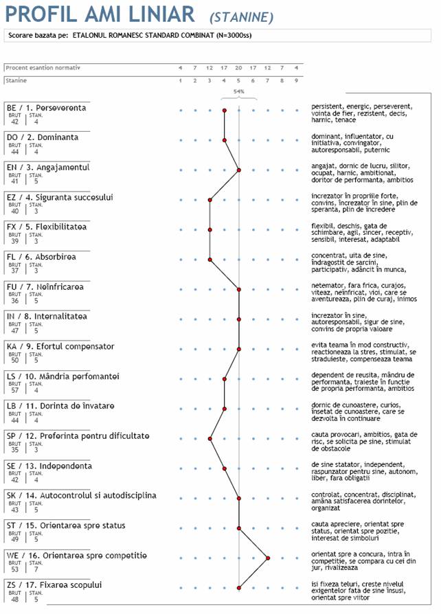 Profilul rezultat in urma administrarii chestionarului AMI este caracteristic pentru toti cei 8 angajati, lucru ce demonstreaza faptul ca acestia au imprumutat idei si obiceiuri unii de la altii si nu au fost instruiti si tratati diferentiat conform caracterelor lor asa cum ar fi procedat un manager de tip transformational. Media scorurilor obtinute se situeaza sub media generala, depasind-o numai in cazul orientarii spre competitie semn ca angajatii nu si-au pierdut simtul de a concura si de a se compara cu cei din jur. Rezultatul tinde sa nu fie unul negativ avand in vedere faptul ca s-au obtinut scoruri medii la 7 dintre indicative, si anume: angajamentul, neinfricarea, internalitatea, efortul compensator, autocontrolul si autodisciplina, orientarea spre status si fixarea scopului. In rest insa toate scorurile sunt sub medie, ceea ce demonstreaza o echipa slab motivata spre a-si atinge scopurile, spre a-si indeplini sarcinile cu succes si eficienta. Angajatii nu sunt nici dominanti, nici perseverenti, nici flexibili, nu au nici siguranta succesului, dar mai ales, le lipseste dorinta de invatare si de a se preocupa de sarcini dificile. In continuare vom lua pe rand fiecare dintre indicatori si ii vom puncta pentru o mai buna analiza.