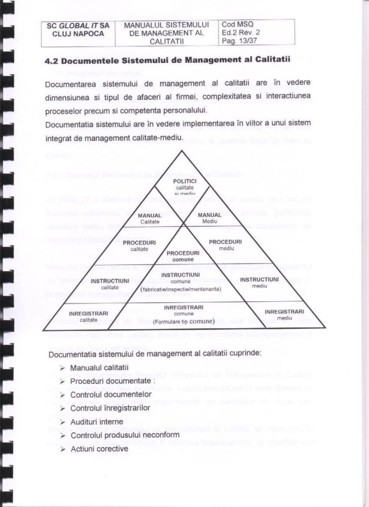 Gestionarea documentelor calitatii Certificarea sistemului calitatii necesita elaborarea documentatiei, descrisa in paragrafele precedente. Implementarea sistemului de managementul calitatii implica necesitatea ca documentele calitatii nuCiteste tot ... 1189 cuvinte