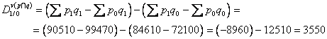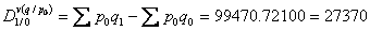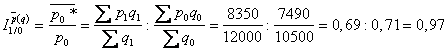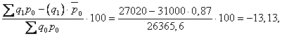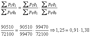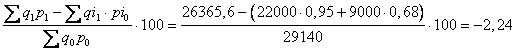 In cazul de fata, acest indice are valoarea 0,994 ceea ce semnifica faptul ca daca preturile din luna ianuarie 2009 ar fi fost aceleasi cu cele din luna decembrie 2008, deci ar fi ramas constante, modificandu-se numai cantitatile vandute, atunci pretul mediu ar fi scazut de 0.994 ori si deci aceasta nu corespunde cu modificarea reala obtinuta datorita influentei modificarii ambilor factori.