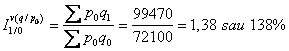 Aplicand aceasta formula si tinand seama ca acest indice semnifica faptul ca daca si in decembrie, perioada de baza, s-ar fi vandut aceleasi cantitati ca in ianuarie, perioada curenta, modificandu-se numai preturile unitare, atunci puteam aprecia ca pretul mediu ar fi crescut de 1,44 ori, ceea ce reprezinta o crestere sensibil mai mare decat cea reala.