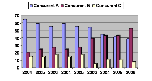 Concurentul A are cea mai mare cota dar e in scadere; din acest motiv ceilalti concurenti cunosc cresteri;