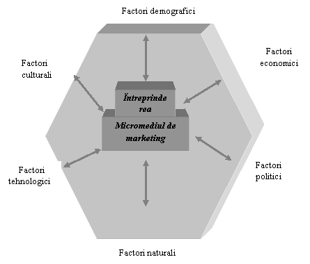 Macromediul de marketing cuprinde fortele externe care actioneaza asupra întreprinderii si a micromediului sau stimulând sau frânând activitatea desfaturata de aceasta. Aceste forte sunt grupate în mediul demografic, mediul economic, mediul tehnologic, mediul politic si juridic, mediul socio-cultural si mediul natural. Acesti factori exercita în permanenta o influenta mai mica sau mai mare asupra activitatii întreprinderii, aflându-se într-o permanenta schimbare. Toate firmele sunt constiente de acest lucru dar nu toate sunt la fel de eficiente în monitorizarea mediului extern, a tendintelor factorilor de mediu si în adaptarea activitatilor desfasurate în consecinta.