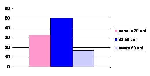Din cele 100 de persoane chestionate 50% se regasesc in intervalul de varsta 20- 50 ani, ceea ce reprezinta ca serviciile de telefonie mobila sunt cunoscute si folosite cu precadere de aceasta grupa de varsta. De asemenea, se poate observa ca si tineretul (33%) prefera servicii de telefonie mobila, procentul fiind in crestere fata de anul trecut.