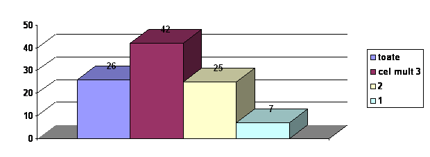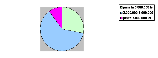 Din graficul alaturat se poate observa ca persoanele intervievate incadrate in grupa de venituri 3.000.000- 7.000.000 lei sunt cuprinse intr-un procent majoritar de 62%, fiind urmate de grupa de venituri "pana la 3.000.000 lei" cu 28%. Acest lucru evidentiaza nivelul mediu de trai al populatiei, in ciuda caruia oamenii cauta sa-si satisfaca pe langa nevoile de baza si pe cele personale, in masura posibilitatilor.
