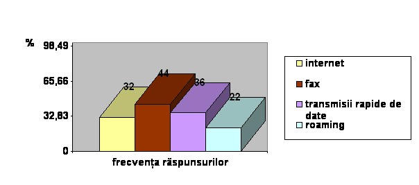 Din graficul alaturat se constata ca 32.83% dintre subiecti acorda o atentie mai mare serviciului de fax, fata de folosirea serviciului de roaming (16.41%), desi valorile sunt destul de apropiate, 23.88 % sunt preocupati de internet, iar 26.86 de transmisiile rapide de date.