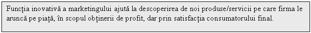 de cercetare a pietei, respectiv a cererii si a ofertei si a necesitatilor de consum; de interconectare (adaptare) a organizatiei la dinamica mediului; de maximizare a profitului; de integrare a activitatilor organizatiei, in raport cu celelalte functii de baza ale organizatiei atat intern, cat si extern. |