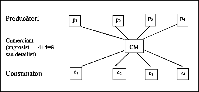 Daca am considera 20 de producatori si de 20 de consumatori, in cazul unei vanzari directe s-ar inregistra 400 de tranzactii (20x20), fata de numai 40 de tranzactii (20+20) atunci cand in circuit apare un intermediar.