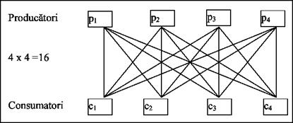 In figura 2 este prezentat un exemplu de distributie nespecializata: patru producatori agricoli (un producator de struguri, un producator de fructe, un producator de legume si un producator de vinuri) livreaza produsele lor unei clientele formate din patru consumatori. Livrarea presupune 16 tranzactii, ceea ce inseamna 16 deplasari ale producatorilor