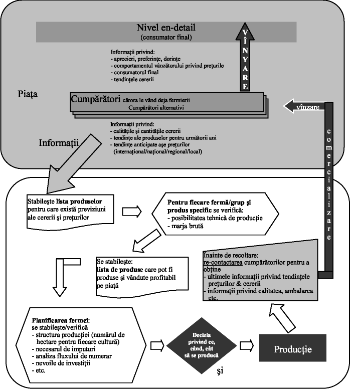- orientarea spre vanzare. Producatorul agricol este orientat tot catre productie, dar incearca sa obtina preturi mai bune, prin consultarea mai multor cumparatori, inclusiv angrosisti si/sau consumatori finali. In cazul cerealelor, de exemplu, producatorii agricoli ar putea incerca sa vanda productia direct unei mori sau unei brutarii, la un pret mai mic decat pretul de achizitionare a cerealelor de catre brutarie sau moara de la Comcereal sau Cerealcom, dar mai mare decat pretul pe care l-ar obtine in prezent prin sistemul monopolist. Consultarea conditiilor de vanzare ale brutariilor si morilor, cat si ale sistemului monopolist, reprezinta un prim pas catre o agricultura profitabila