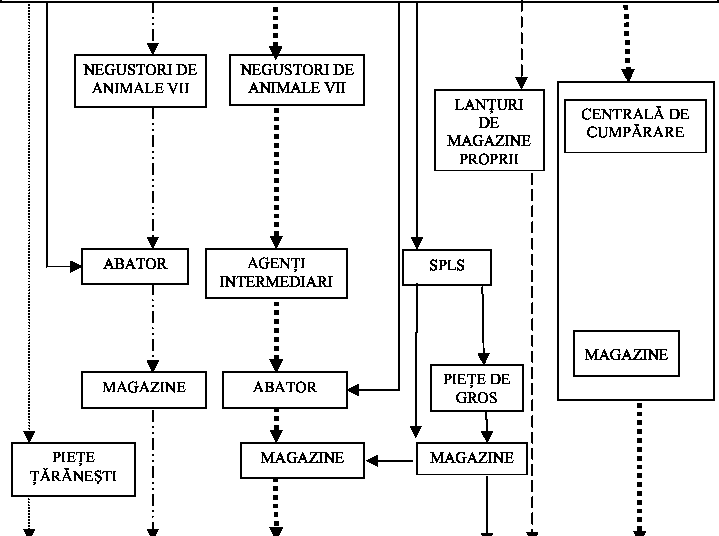 La carne (figura 20) circuitele de distributie cu cele mai mari avantaje sunt 3 si 4, cu conditia crearii unor societati specializate in prestarea de servicii logistice (SPSL), care sa preia tot circuitul "viu" al carnii. Aceste societati pot fi constituite, unde mai este cazul, prin restructurarea actualelor societati comerciale de industrializare a carnii cu capital de stat. Ele pot asigura lantul de frig necesar si pot stimula asocierea crescatorilor de animale.