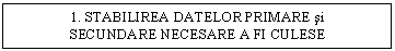 Prima etapa: stabilirea datelor primare si secundare necesare a fi culese, dupa cum indica si denumirea are scopul de a stabili cele doua categorii de date necesare a fi culese fara a omite insa precizarea datelor relevante cu ajutorul carora se vor lua deciziile de marketing.