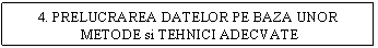 Cea de-a patra etapa presupune analiza datelor culese si evaluarea acestora cu ajutorul unor calcule matematice precum analiza univariata, bivariata si multivariata a datelor. Printre metodele cunoscute in practica amintim, pentru analiza univariata, media aritmetica, amplitudinea, abaterea medie liniara, dispersia, abaterea medie patratica, mediana, modulul, etc. Analiza bivariata se realizeaza prin: tabelarea incrucisata, testul de independenta (hi-patrat), analiza regresiei, analiza corelatiei iar analiza multivariata are la baza coeficientul de corelatie multipla, coeficientul de determinare multipla, analiza de varianta, scalarea multidimensionala, analiza discriminantei, etc.