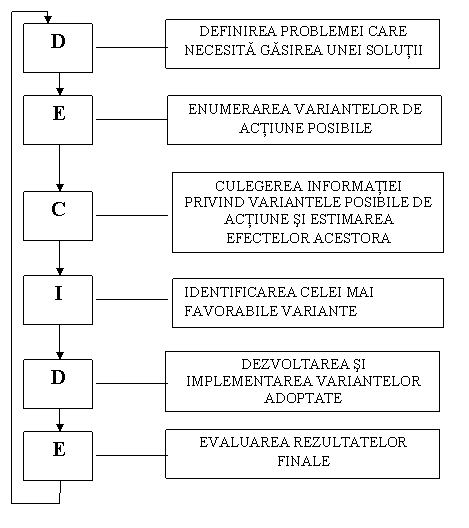 - estimarea eficientei diferitelor moduri posibile de actiune, etapa care se refera la eficienta economica a acestora si consecintele posibile pe care le poate avea aplicarea lor. Aceasta estimare a eficientei modurilor posibile de actiune trebuie sa ia in considerare urmatoarele elemente: raportul dintre efecte si rezultate, factorul timp, riscul implicat, resursele disponibile, etc.;