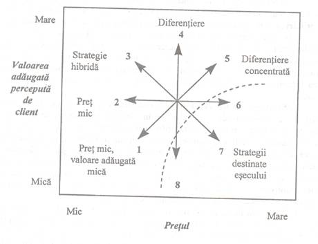 Dintre cele opt variante prezentate, firmaa poate opta fie pentru o strategie bazata pe pret (strategiile 1 si 2), fie spre o strategie de diferentiere (strategiile 3 si 5). Se recomanda evitarea variantelor 6 - 8, deoarece conduc firma spre esec. Particularitatile variantelor ce pot fi considerate sunt urmatoarele: