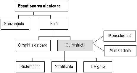 Dintre schemele de esantionare cu restrictii, cele mai utilizate sunt: esantionarea sistematica aleatoare, esantionarea stratificata, esantionarea de grup (nestratificata) si esantionarea multistadiala.
