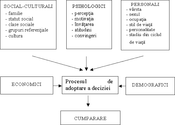 Se observa, ca, desi, fiecare autor incearca o grupare proprie in functie de opinia sa cu privire la conceptul de comportament al consumatorului sau de proces de decizie de cumparare si de criteriile pe care le stabileste, factorii esentiali de influenta ii intalnim in toate acestea, ceea ce ne obliga sa-i abordam mai pe larg.