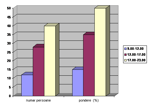 In functie de orarul de functionare se poate observa ca ponderea cea mai ridicata de cumparaturi,și anume 50% din cele 80 de persoane este data de intervalul orar 17.00-23.00,urmata de 35% de intervalul 12.00-17.00 și cu doar 15% de intervalul orar 9.00-12.00.